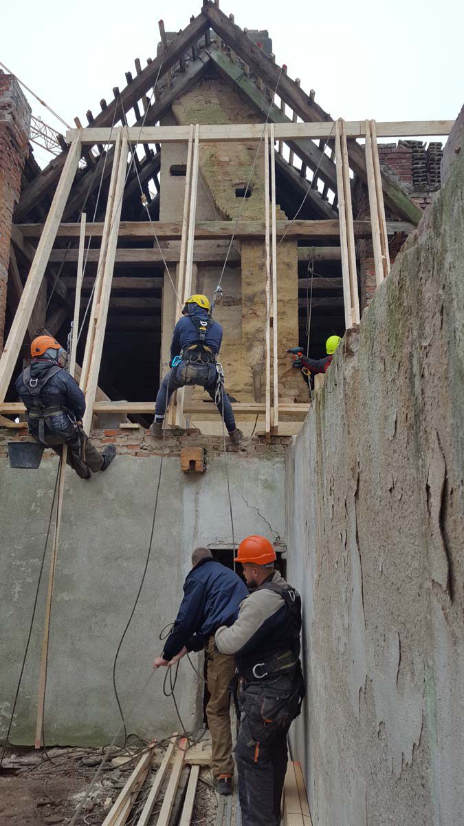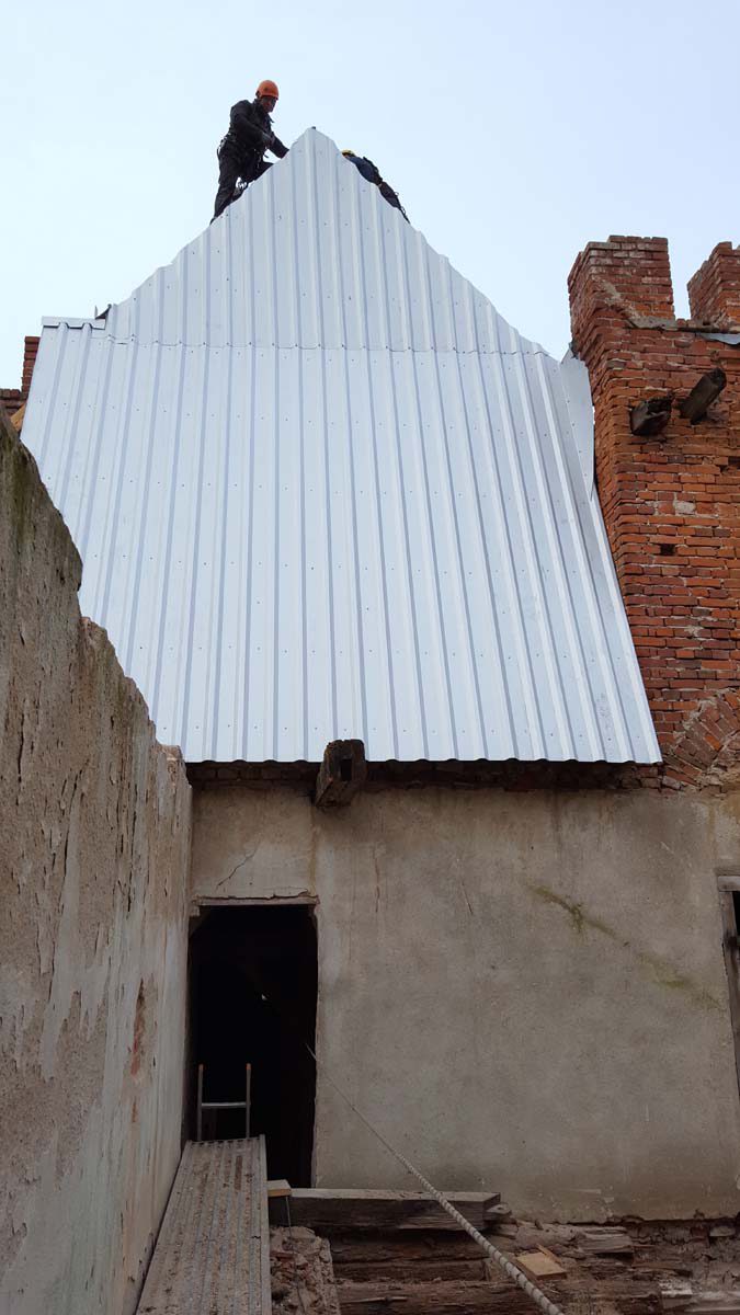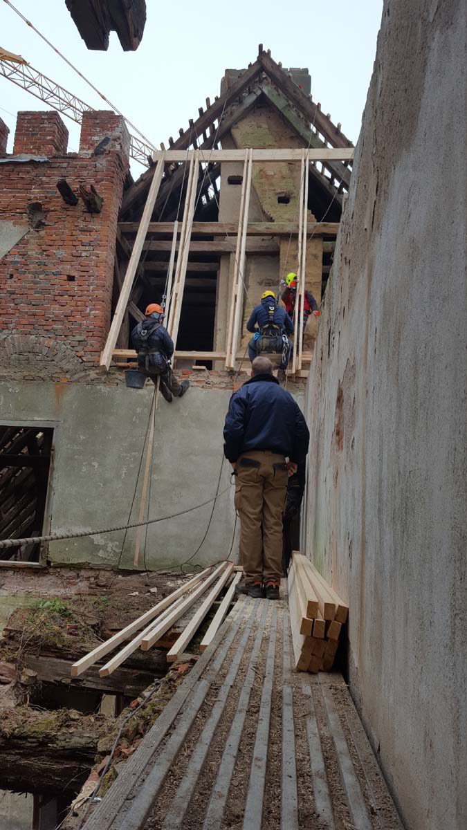 Die offenen Giebel der Seitenflügel zum Mitteltrakt werden geschlossen