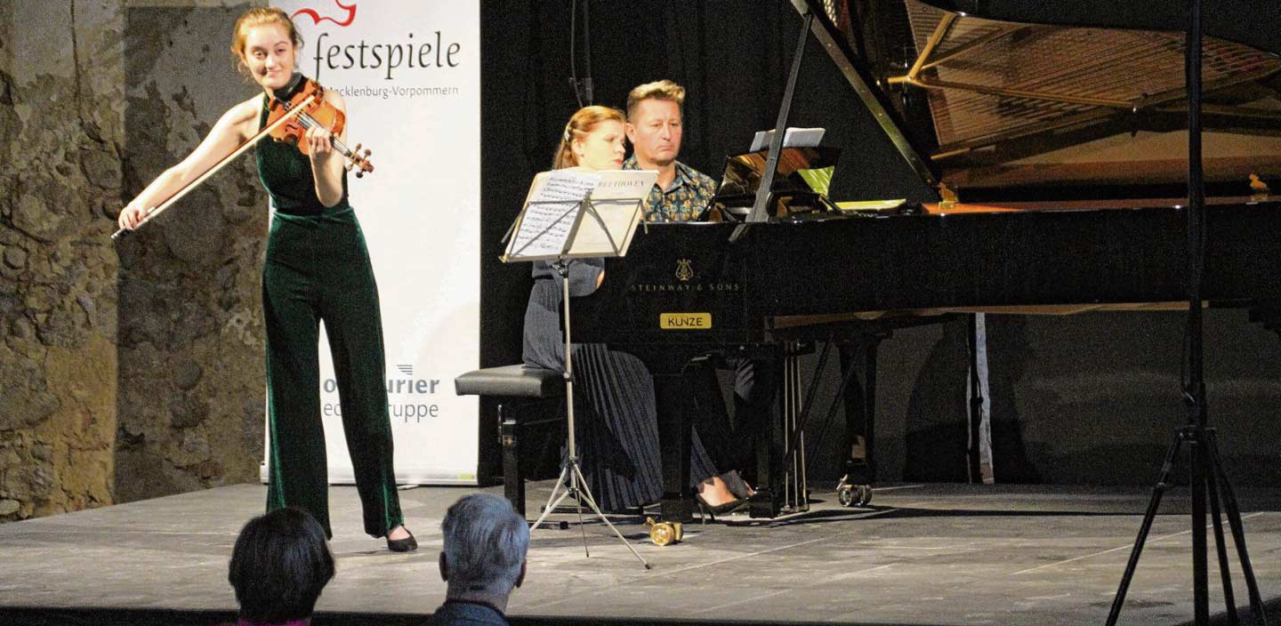BROOCK. „Dieses Konzert wird mir mit Sicherheit mein ganzes Leben lang in Erinnerung bleiben“, wusste Ursula Haselböck schon vor dem ersten Ton an diesem Mittwochabend in der historischen Reithalle neben dem Schloss Broock. Durchaus mit etwas Aufregung in der Stimme. Zum einen, weil sie gerade erst mit dem September-Beginn offiziell die Leitung der Festspiele Mecklenburg-Vorpommern von Markus Fein übernommen hat und dies also die erste derartige Veranstaltung unter ihrer Regie darstellte. Zum anderen, weil die Intendantin und ihr Team nach dem Corona-Lockdown sozusagen musikalisch einen Neustart unter erschwerten Bedingungen vollzogen. Und obendrein beeindruckte sie der Ort der Premiere mit seiner Geschichte und seinen Zukunftsaussichten. „Das ist eine ganz besondere Entdeckung für mich“, schwärmte die Frau, bevor sie den Musikern die Bühne überließ.. …